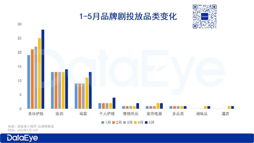 从品牌剧的投放品类来看,1-5月份,品牌剧各品类投放数目稳步晋升。5月份,美妆护肤类、医药类、母婴类、小我私家照顾护士类等品类的投放剧数均创本年新高。