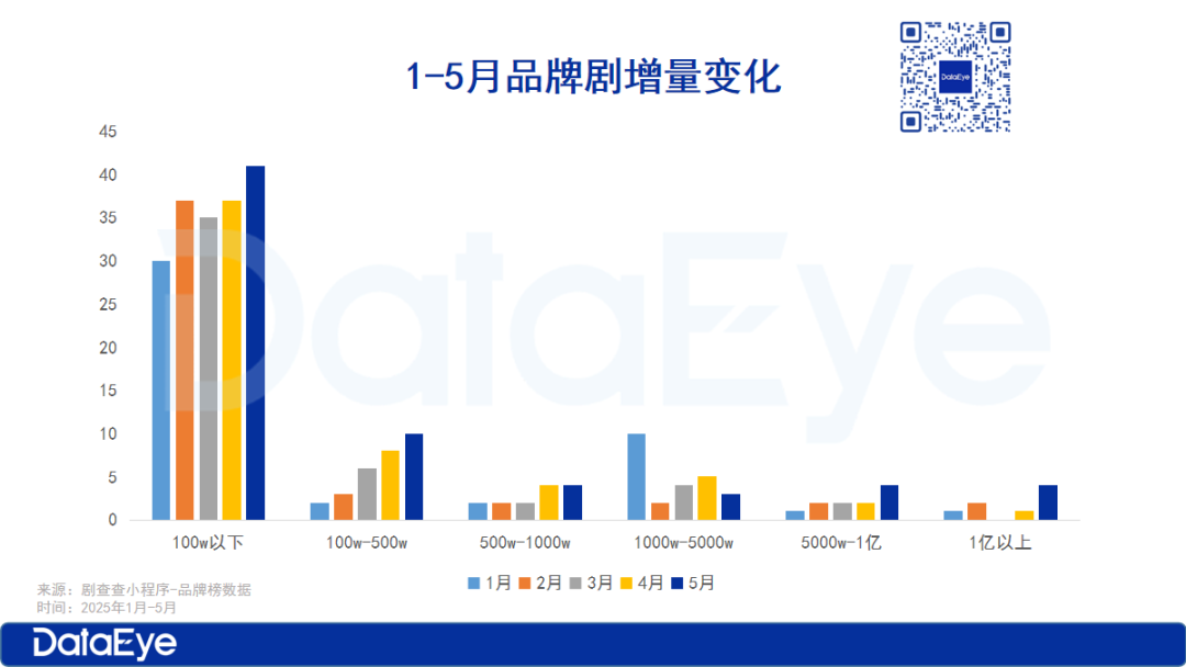 从近三个月品牌剧的增量变化来看,险些各播放区间的微短剧数目均有所晋升,除了了增量于1000W-5000W的微短剧数目于5个月内履历了两次下滑。2月份下滑重要由于春节后播放热潮消退,5月份下滑则由于部门微短剧增量升高至5000W以上。